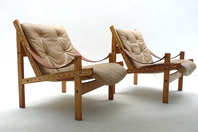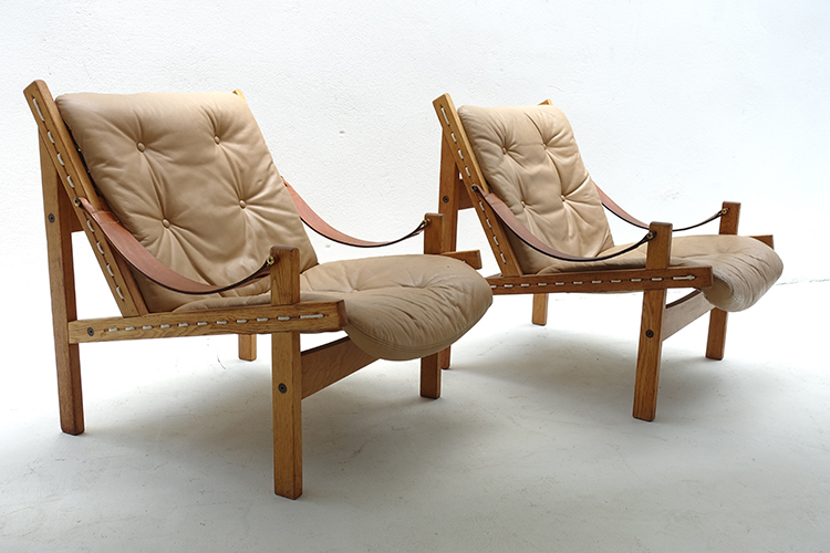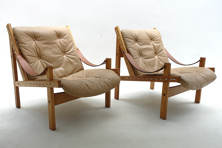 Scandinavian Hunter Lounge chairs Oak frame, light brown patinated leather. Designed by Thorbjørn Afdal for Bruksbo, Norway 1960's. W67 x D80 x H78 cm