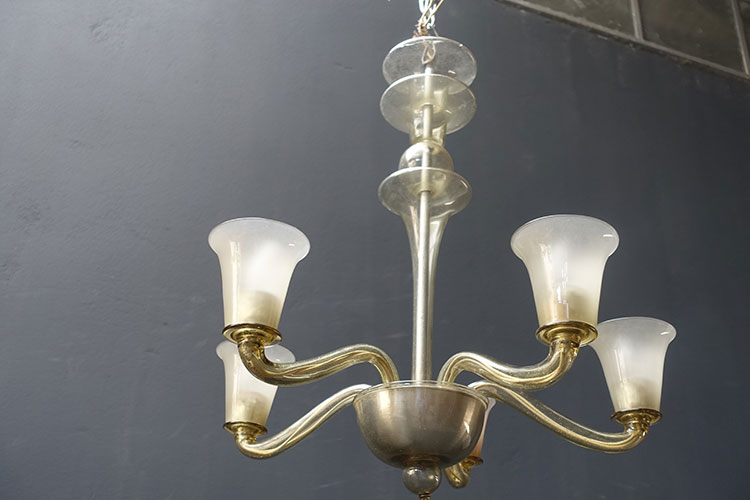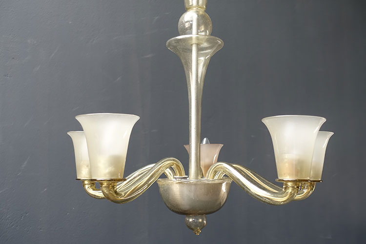 Chandelier with five arms of smoke-colored, frosted glass. 70h Ø 64 cm.
