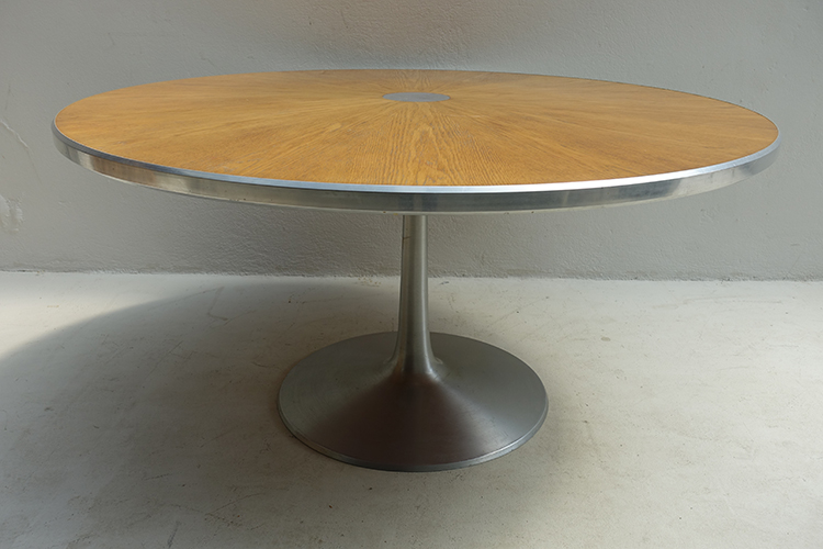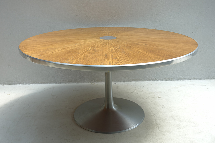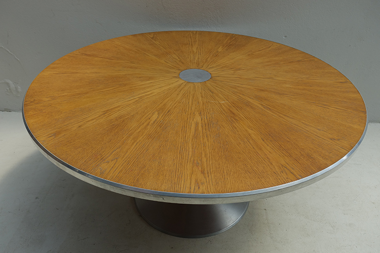 Mid-century dining table by Poul Cadovius for France & Søn, Denmark 1960s. Frame and base in aluminum, circular plate in oak. 70h, Ø140