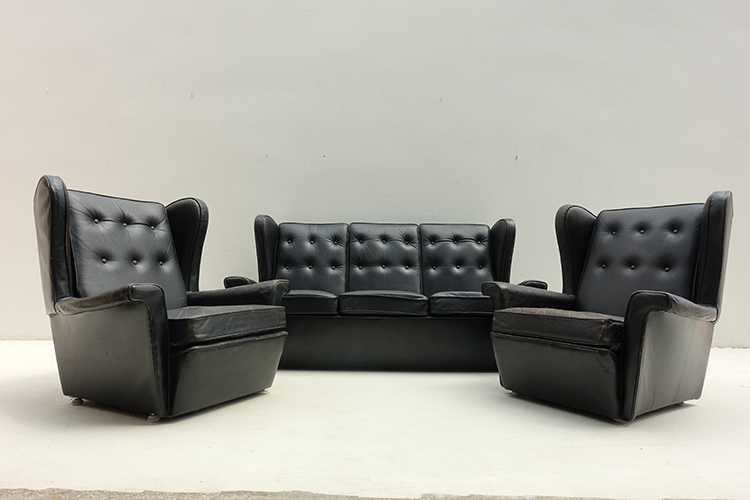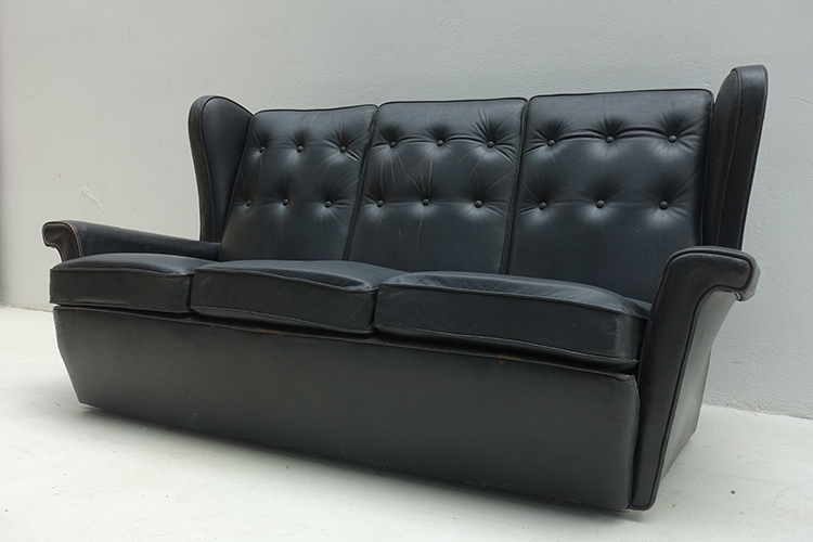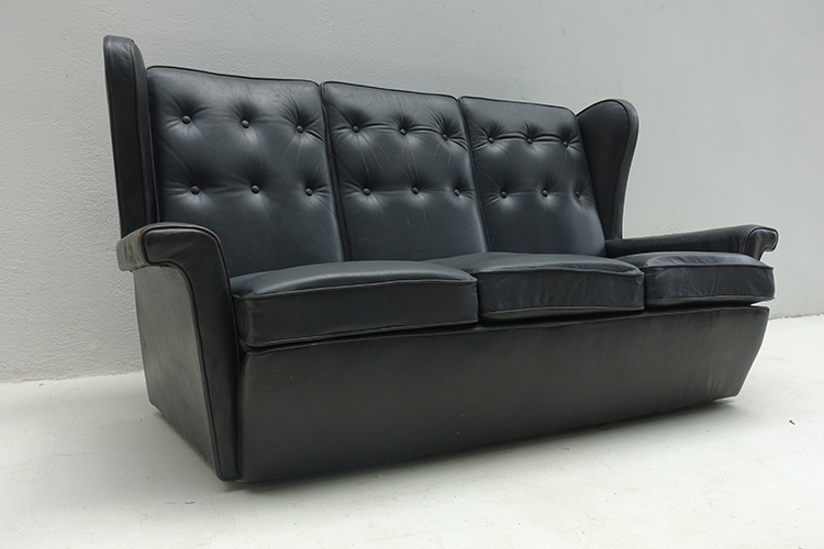 three seater black leather sofa, Denmark 1950’s 174x90x90h