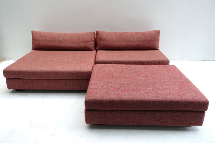 fabric, wooden legs, Denmark two-seater sofa L. 115cm x D. 96cm x H. 61 cm. , SH. 42cm. chaise lounge L. 115cm x D. 140cm x H. 61 cm. , SH. 42cm. puff L. 115cm x D. 96cm x H. 42 cm.
